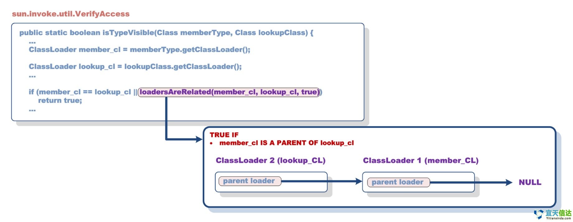 展現(xiàn)原始漏洞的代碼樣例,目標(biāo)類的ClassLoader并沒(méi)有進(jìn)行檢查;來(lái)源:Security Explorations。Oracle在2013年9月提供了一個(gè)修正,作為Java 7u40的一部分,包含了類可見(jiàn)性的檢查,它會(huì)對(duì)比預(yù)期類型和傳入類型的ClassLoader,對(duì)比方式如下:如果兩個(gè)ClassLoader相同的話,那么按照定義這兩個(gè)類型是完全兼容的;