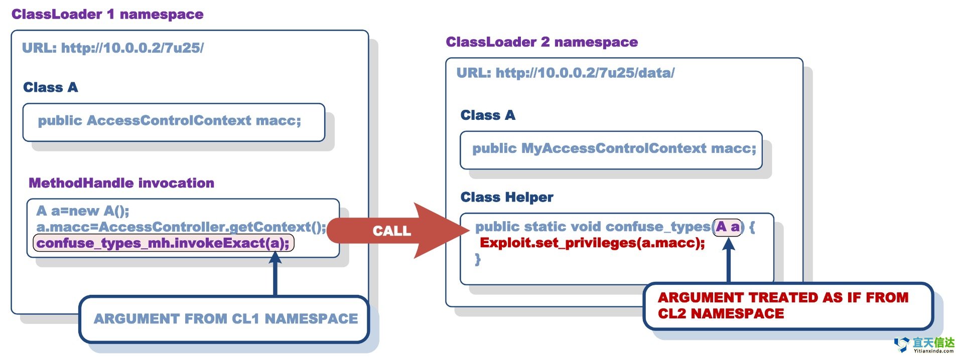 如果兩個(gè)不同的類具有相同的類名和包名,但是由不同的ClassLoader所加載的話,Java會(huì)認(rèn)為它們是不相等的,在它們兩者之間進(jìn)行賦值的話,將會(huì)導(dǎo)致ClassCastException異常。這樣的話,就能保護(hù)環(huán)境免受類仿造的攻擊。部分修復(fù)以及由此導(dǎo)致的漏洞Security Explorations較早報(bào)告了這個(gè)漏洞,并將其歸類為CVE-2013-5838,這個(gè)漏洞可以描述為,當(dāng)通過(guò)Method Handle調(diào)用方法時(shí),對(duì)于被調(diào)用方法的那個(gè)類,它的ClassLoader并沒(méi)有進(jìn)行檢查,這意味著攻擊者可以按照上文所述的方法進(jìn)行類的仿造。